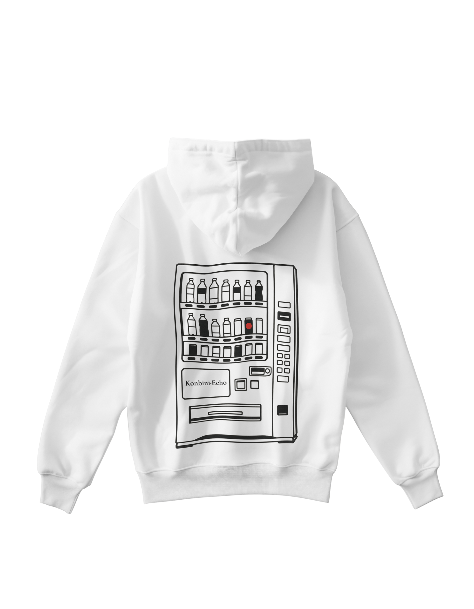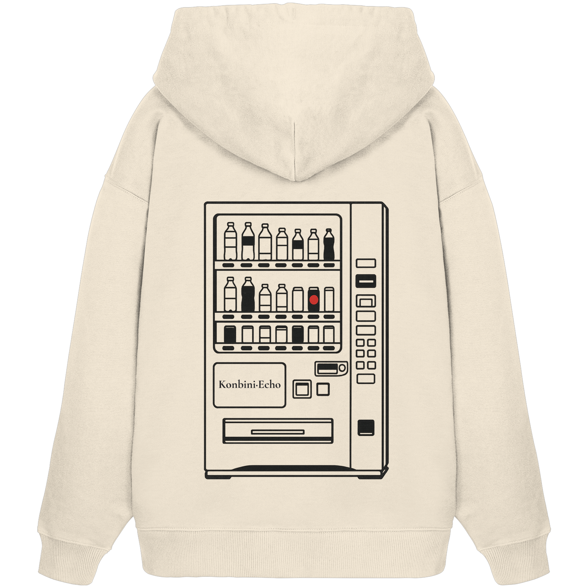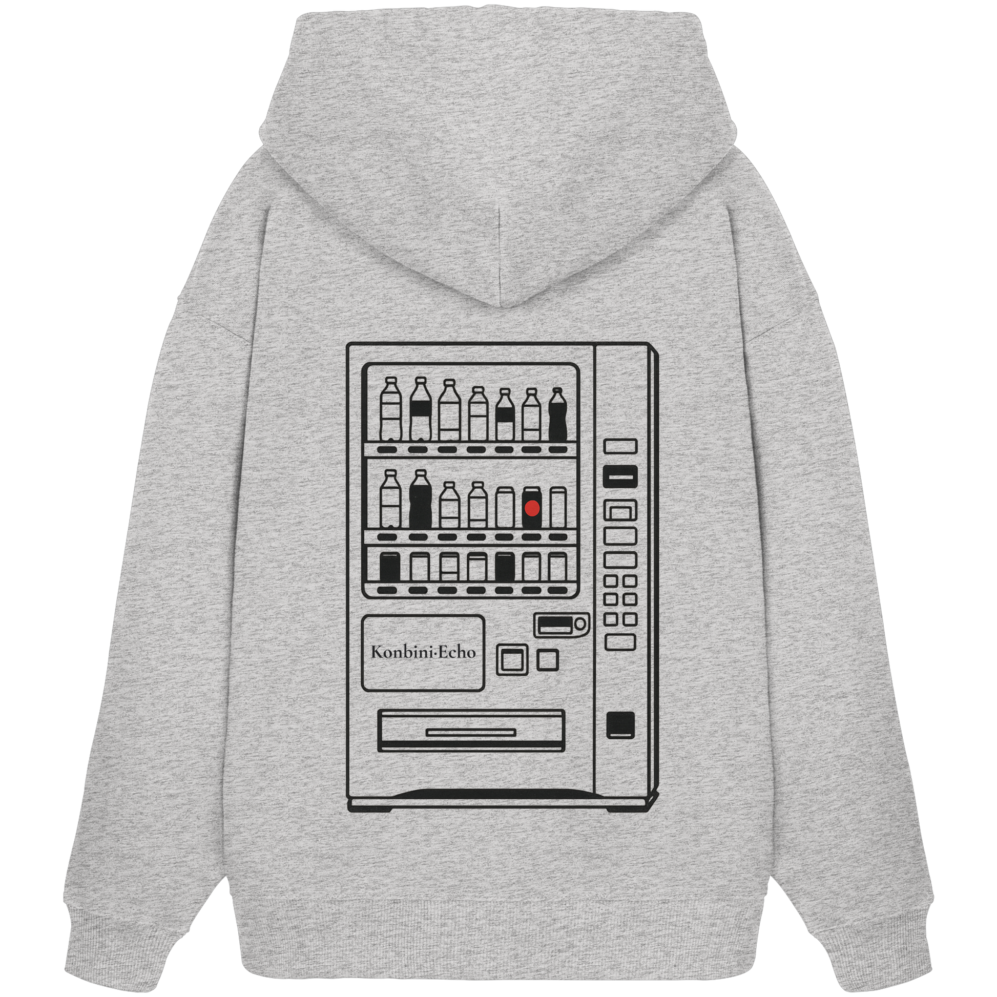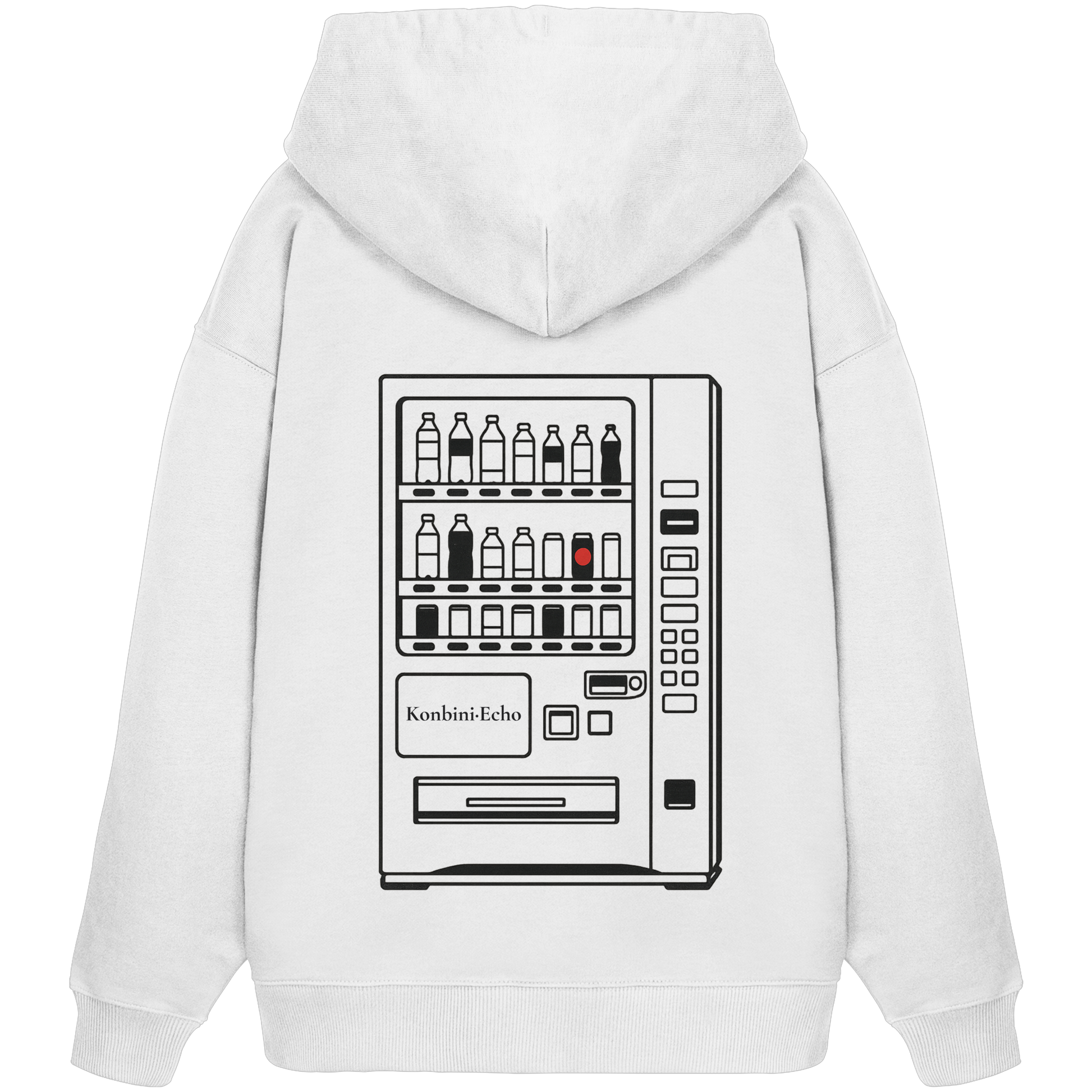 Erinnere dich an diese stillen Nächte in Japan: Das Design zeigt einen ikonisch japanischen Getränkeautomaten als Line Art mit nur einem rot leuchtenden Auswahlknopf. Minimalistisch, zurückhaltend, schnell nostalgisch. Ein Symbol für Einsamkeit, Routine, aber auch Geborgenheit im Urbanen. Das Design ist auf der Rückseite platziert wie eine stille Erinnerung, die der Mann mit sich trägt.